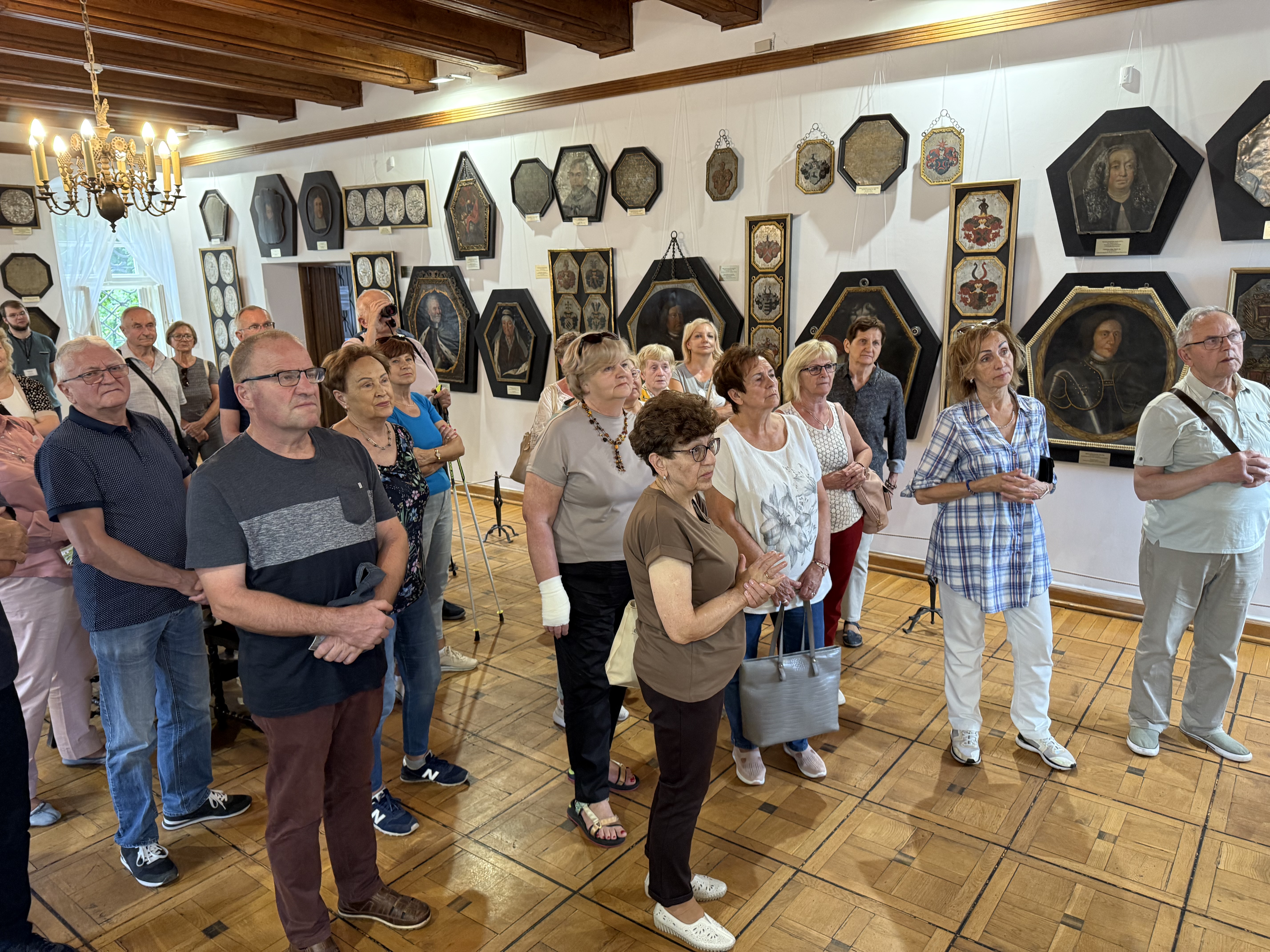 Muzeum Ziemi Międzyrzeckiej im. Alfa Kowalskiego jest prowadzone przez powiat międzyrzecki. Po muzeum oprowadzał nas jego pracownik Paweł Pawlak. Bardzo interesująco opowiedział nam o historii tego miejsca, jego zbiorach - ze szczególnym naciskiem na wielokulturowe dziedzictwo Ziemi Międzyrzeckiej. Przez kilkaset lat zamieszkiwali tu obok siebie Polacy, Niemcy, Żydzi, a nawet Holendrzy i Szkoci, wyznawcy różnych religii. W zbiorach muzealnych znajduje się bezcenna i największa w Polsce kolekcja portretów trumiennych z okresu baroku, blach herbowych i epitafijnych oraz opisów szlacheckich pogrzebów. Wyjątkowe w tej kolekcji są portrety trumienne szlachty niemieckiej, która osiedliwszy się na tym terenie, przyjmowała polskie obyczaje. Obejrzeliśmy również wystawę etnograficzną pokazującą dawną kulturę ludową Ziemi Międzyrzeckiej. Muzeum posiada także eksponaty z okresu antycznego. Dużą atrakcją było obejrzenie murowanego zamku, wzniesionego za czasów Kazimierza Wielkiego i wysłuchanie niezwykle ciekawych, burzliwych dziejów grodu i zamku w Międzyrzeczu. Sięga ona X wieku, kiedy to te tereny podbiło Państwo Piastów. Jest to jeden z najstarszych ośrodków chrześcijaństwa w Polsce : najwcześniejsze wzmianki o Międzyrzeczu dotyczą przybycia tu św. Wojciecha w 966 roku i założenia w 1001 roku nieopodal grodu pierwszego na ziemiach polskich klasztoru. Zamordowani tu w 1003 roku benedyktyni, to pierwsi polscy męczennicy chrześcijańscy. Kult tzw. Pięciu Braci Polskich rozpowszechnił się w Polsce, w Czechach, na Morawach i we Włoszech. W burzliwej historii Ziemi Międzyrzeckiej zapisały się liczne wojny i najazdy, będące skutkiem rywalizacji książąt dzielnicowych, wojen domowych w Wielkopolsce, wojen polsko - krzyżackich, potopu szwedzkiego. Po II rozbiorze (1793 r.) nastąpiła ostateczna utrata znaczenia wojskowego Międzyrzecza, a zamek zajęty został przez Królestwo Prus. Warto przy tej okazji wspomnieć, że Międzyrzecz w swoich dziejach gościł między innymi czterech cesarzy i co najmniej 11 królów, licznych książąt, siedmiu katolickich świętych oraz wiele innych postaci znanych z kart historii. Zwiedzanie muzeum i zamku w Międzyrzeczu to niezwykła lekcji historii, przeprowadzona w pięknym parku z okazami starodrzewów, który w upalne sobotnie przedpołudnie dawał nam wytchnienie, a dla oczu był zieloną ucztą…Po takiej dawce wiedzy, obejrzeliśmy jeszcze główne punkty zabudowy miejskiej Międzyrzecza, między innymi Ratusz, Rynek, dawne koszary i inne zasługujące na uwagę punkty w mieście. Na przerwę i odpoczynek nasz przewodnik Pan Tadeusz Świder zaproponował nam urocze miejsce, gdzie historia przenika się z nowoczesnością. Udaliśmy się do obiektu „Willa Starosty”, otoczonego pięknym parkiem – ogrodem, w którym mieści się obecnie hotel i restauracja. W okresie międzywojennym był to budynek reprezentacyjny starostwa. Po okresie użytkowania przez wojsko budynek został odrestaurowany i dziś cieszy wspaniałą architekturą i wnętrzami. Grupa nasza rozgościła się przy kawie w pięknym ogrodzie, a wyśmienitym jak zawsze, własnoręcznie upieczonym ciastem, częstowała nas koleżanka Stefania Bagrowska, której za to bardzo dziękujemy.